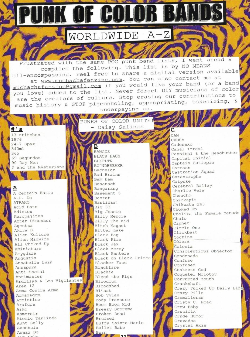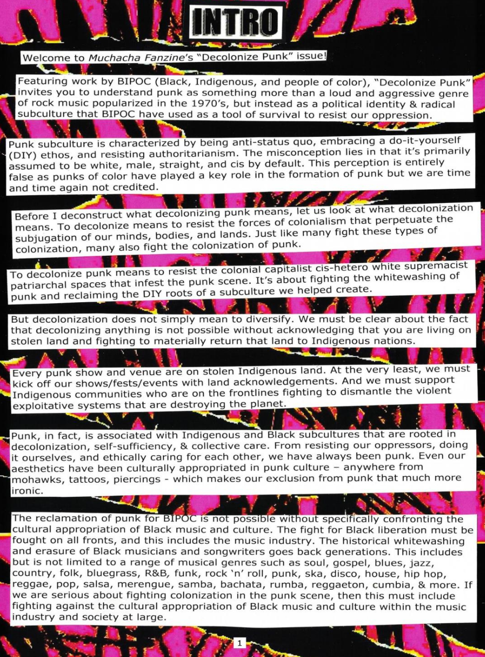 While punk is characterized as being anti-status quo and embracing a do-it-yourself (DIY) ethos, the stereotype is that punk is white by default. Aimed at celebrating the overlooked contributions of punks of color, Muchacha Fanzine’s “Decolonize Punk” explores how punk is a political identity and radical subculture that Black, Indigenous, and people of color (BIPOC) use as a tool to resist systemic oppression. Blending essays, visual art, photography, creative writing, band recs, and lyrics, “Decolonize Punk” is a call of action to combat the colonial white supremacist patriarchal forces that infest our scene (and our world).